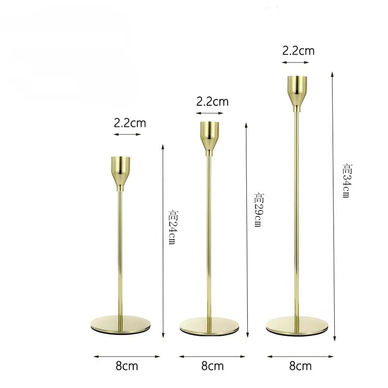 Overall Heights per set: 9.45in / 24cm; 11.42in / 29cm; 13.39in / 34cm Diameter of the base: 3.15in / 8cm Diameter of the top holder: 0.9in / 2.2cm